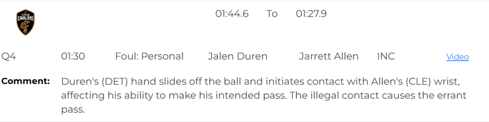 第一次是漏判,发生在距离第四节结束还有1分30秒。杜伦的手从球上滑开,主动接触到了艾伦的手腕,影响了他完成预期传球的能力。这次非法接触导致了艾伦的传球失误。这本该吹杜伦防守犯规,但裁判没有响哨,这是一次漏吹的防守犯规,并导致骑士失误,对手抢断得分。活塞获利,骑士吃亏。