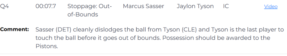 第三次也是错判,发生在距离第四节结束还有7.7秒。活塞的萨瑟干净地从泰森手中断球,泰森是球出界前最后触球的球员。球权应判给活塞队。但裁判判给了骑士,这是一次错误的判罚,活塞吃亏,骑士获利。